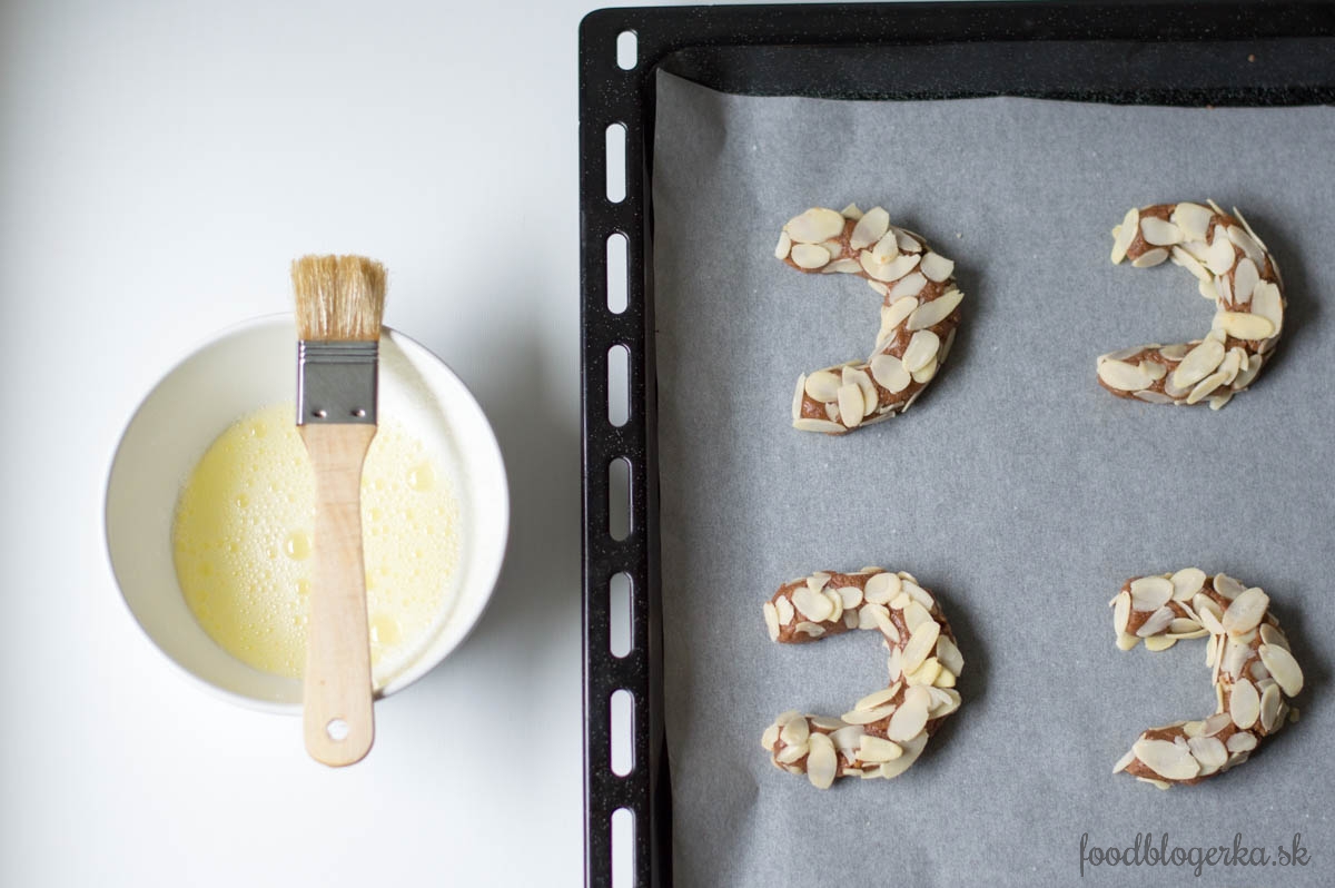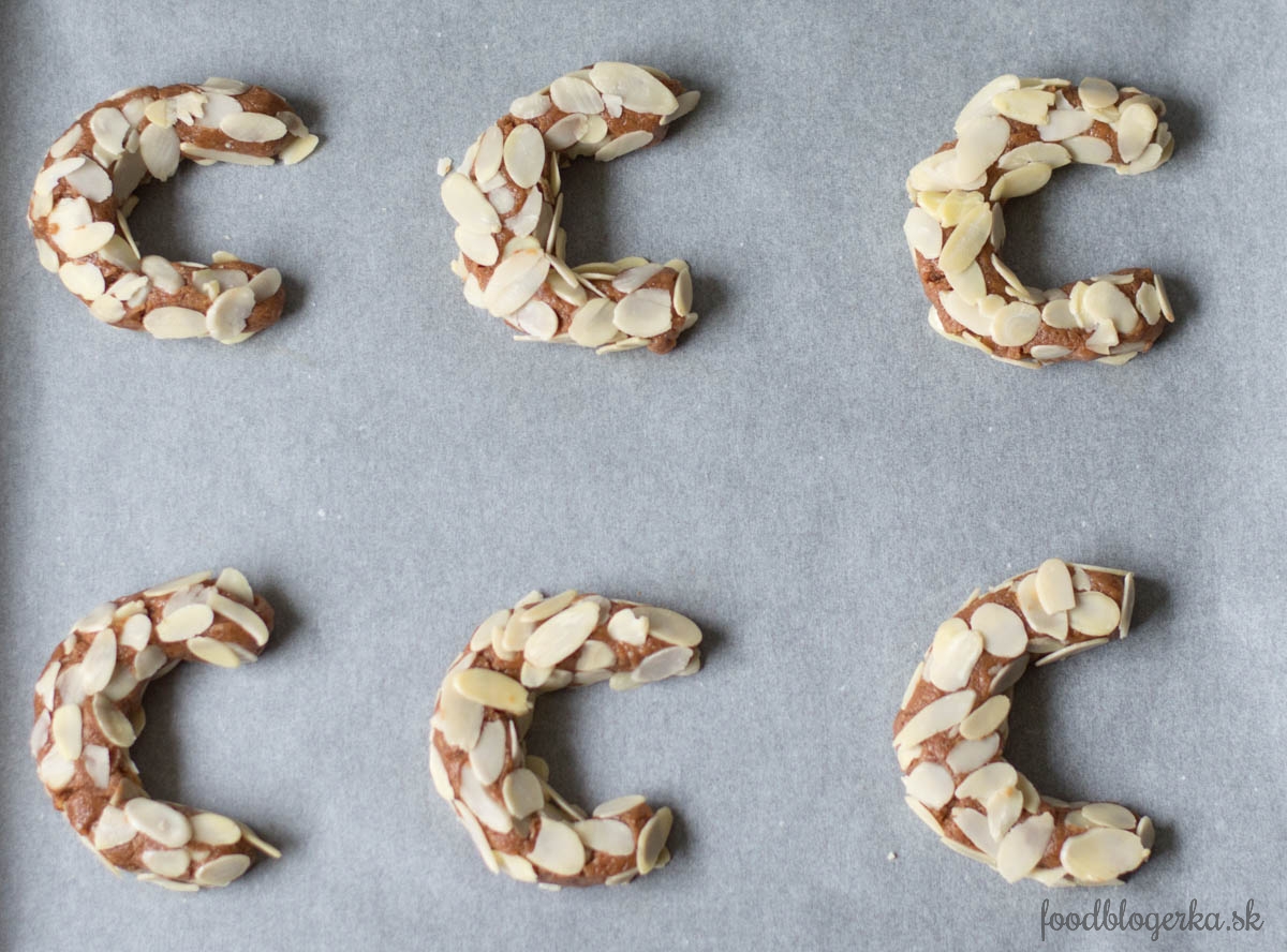 Mandľovú pastu dáme do misy a 3 minúty miešame. Pridáme cukor. Potom 3 PL vaječných bielkov, ktoré sme predtým prešľahali. Masa nám zhustne, riadne miešame, aby mala rovnakú konzistenciu. Pridáme 3 PL mandľovej múky. Do veľkého plytkého taniera si vysypeme mandľové lupienky. Na ňom tvarujeme rovnaké šúľky (35 g). Na plechu vystlanom papierom na pečenie ich dotvarujeme na tvar U. Povtláčame všetky odpadnuté lupienky. Necháme na plechu odstáť 30 minút. Potom potrieme zvyškom bielka, do ktorého sme pridali 1 PL vody.