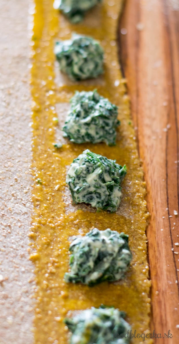Ako urobiť plnku? Špenát si dáme do veľké hrnca, prilejeme cca 50 ml vody, prikryjeme a varíme. Uvidíte ako sa špenát scvrkáva, preklopte spodný špenát na vrch. Odstavte, dajte špenát na dosku (bez vody) a veľkým nožom pokrájame na kúsky. V miske si rozmiešame ricottu, soľ, korenie a žltko. Pridáme špenát a premiešame. A je plnka hotová. Bola úžasná a musela som sa ovládať, aby som ju nezjedla 🙂 Tie najjednoduchšie chute sú vždy najlepšie.