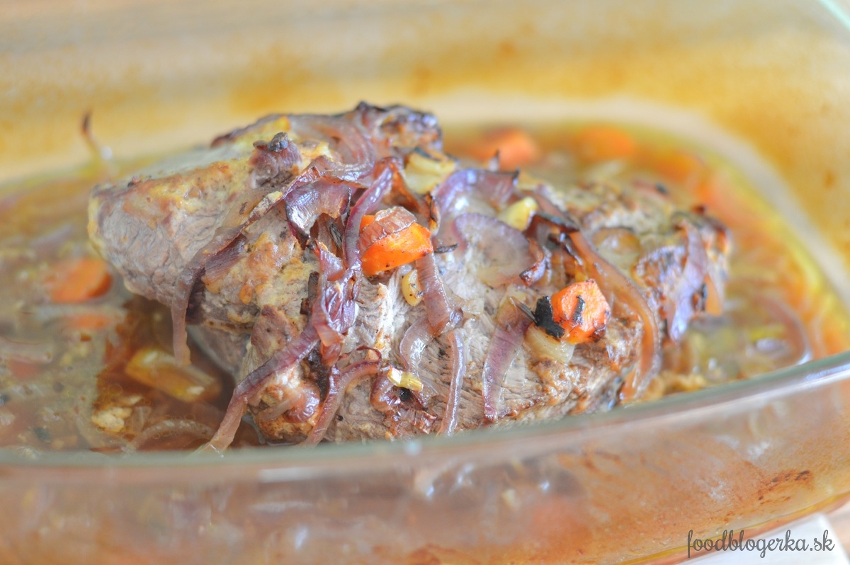 Mäsko okoreníme a osolíme, potrieme horčicou (pokojne aj rukami, je to tak rýchlejšie) a posypeme rovnomerne múkou. Opražíme na výpeku zo všetkých strán mäsko, aby sa nám zatiahlo. Ak je potrebné, dáme predtým ešte olej, aby sa to malo na čom oprážať. Potom opražené mäsko dáme do zapekacej misy spolu s výpekom a pridáme aj vývar. Zakryjeme a dáme do rúry na 2 hodiny pri 180 stupňoch.