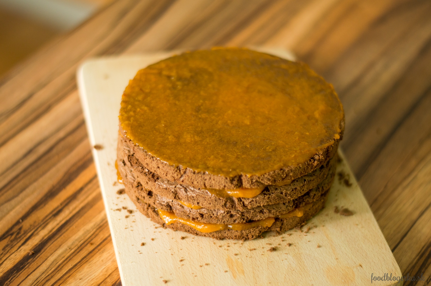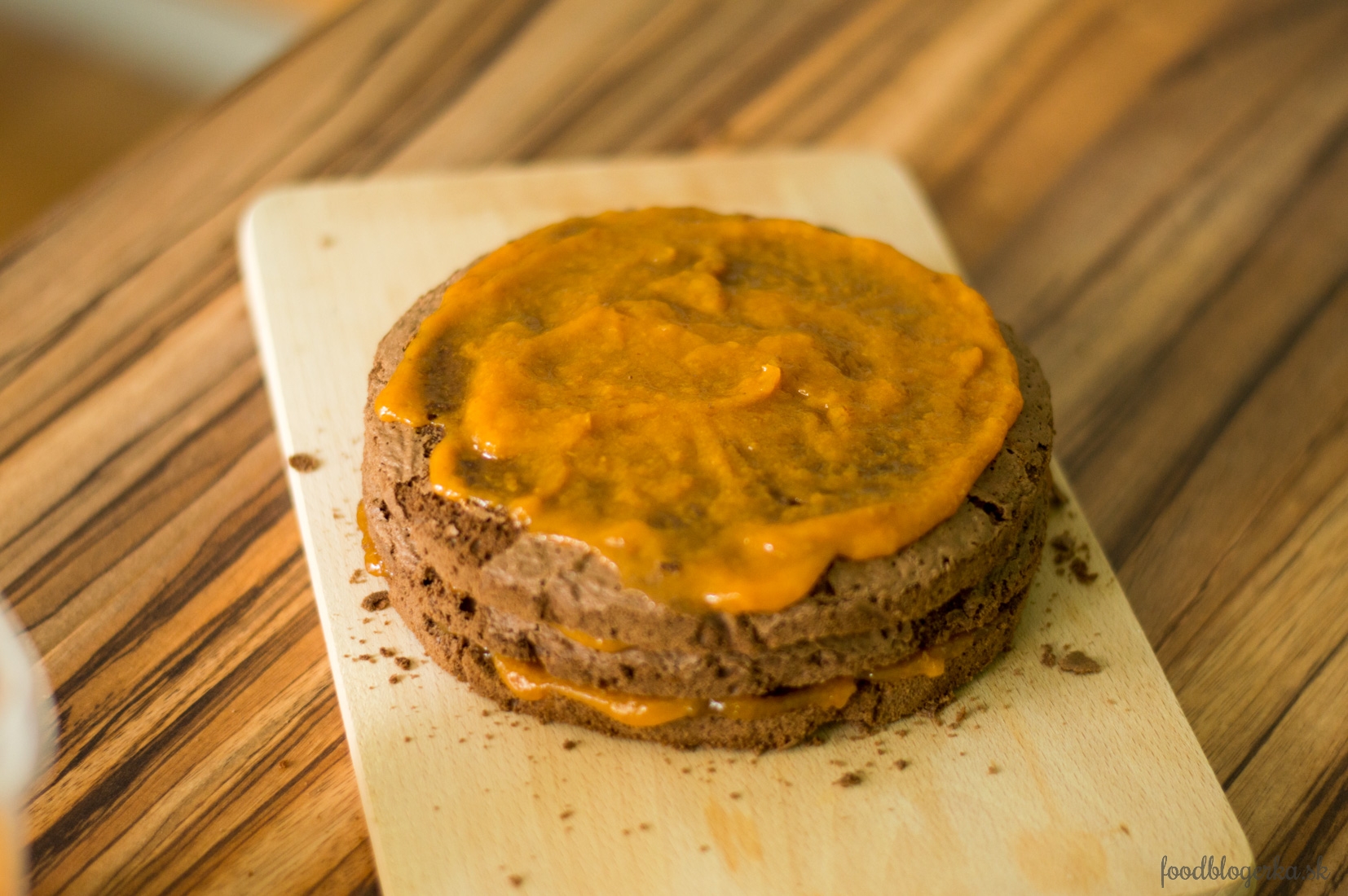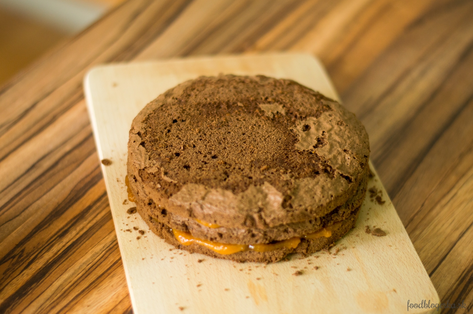 Keď sú obe cestá vychladnuté, rozrežeme ich stredom nitkou. Získame tak 4 pláty, ktoré plníme marhuľovým džemom, ktorý si dojemna vyšľaháme tyčovým mixérom, aby tam neboli kúsky ovocia. Primešame do neho amaretto, alebo rum.
