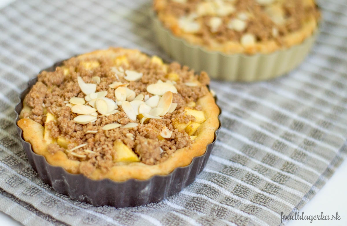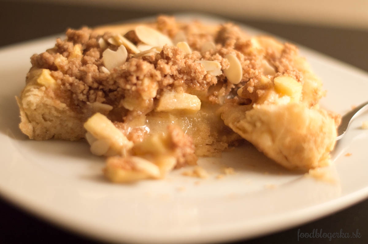 Cesto si rozvaľkáme na hrúbku 3 cm a pokrájame naň tenké plátky masla (50 g). Poskladáme a opakujeme, ale teraz už natierame rozpustené maslo (100 g). Cesto nám bude postupne kysnúť. Keď maslo minieme. Cesto si rozvaľkáme na výšku 7 mm a vykrajujeme kruhy, ktoré vložíme do maslom vymastených tartaletkových foriem. Rovnomerne rozmačkáme. A vyložíme rozvaľkaním marcipánom. Na marcipán dáme jablkovú plnku a na ňu posýpku. Posypeme mandľovými lupienkami. Pečieme 15 – 20 minút.